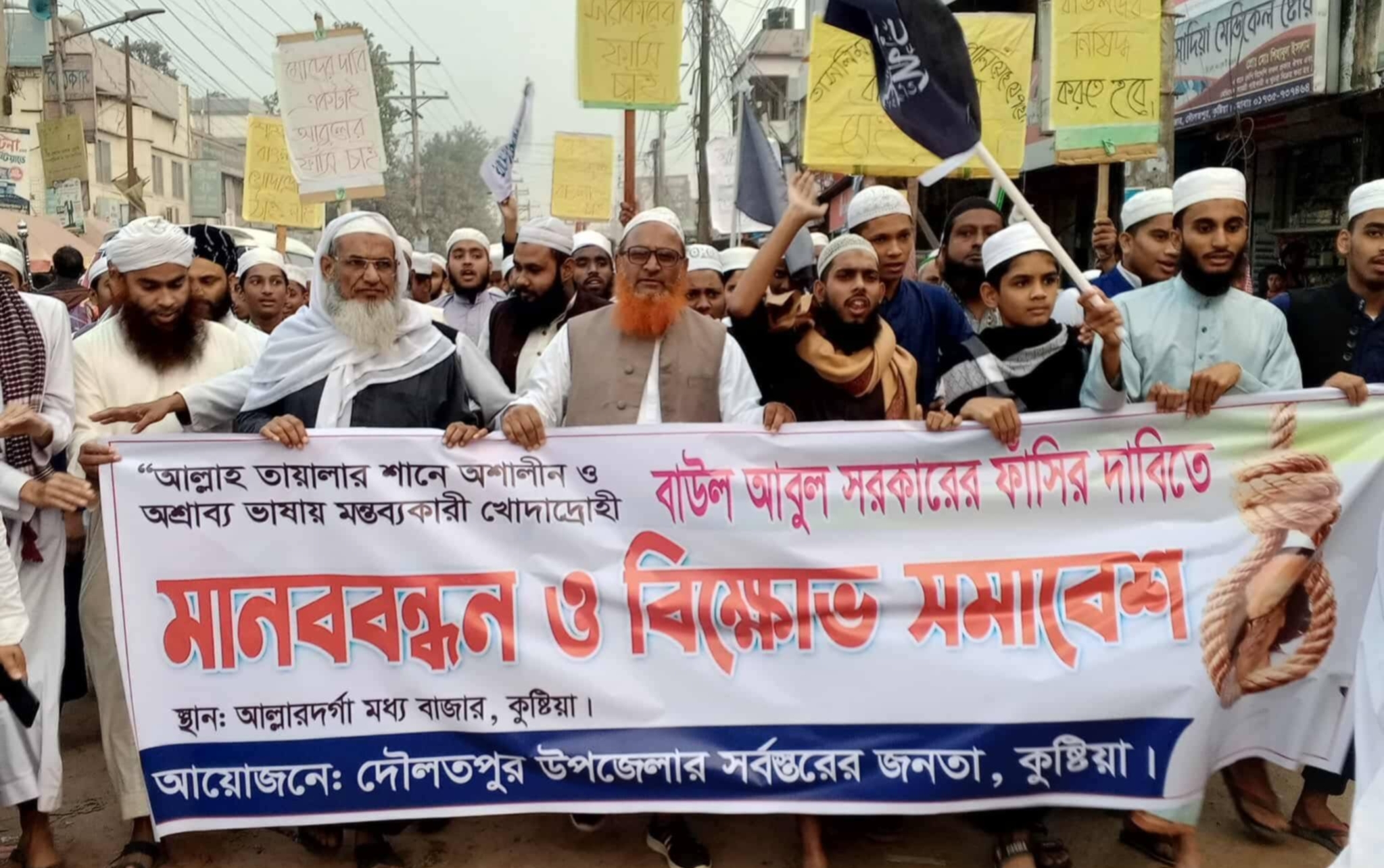 কুষ্টিয়ার দৌলতপুর উপজেলার আল্লার দর্গায় বাউল আবুল সরকারের ফাঁসির দাবিতে মানববন্ধন ও বিক্ষোভ মিছিল অনুষ্ঠিত হয়েছে।