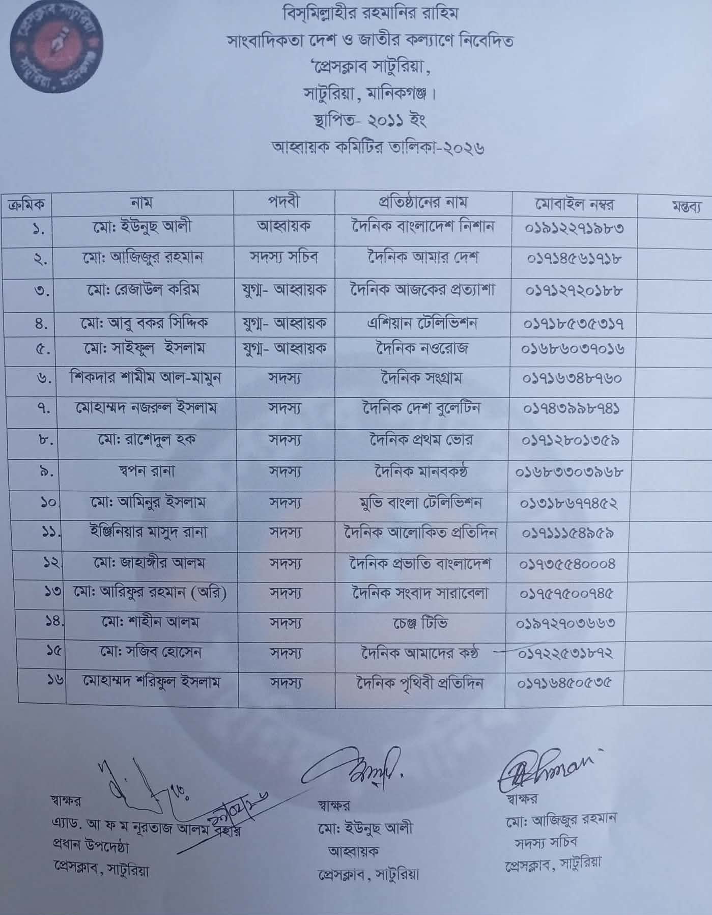 মানিকগঞ্জের সাটুরিয়া উপজেলায় ১৯ ফেব্রুয়ারি বৃহস্পতিবার দুপুর ৩:৩০ টায় প্রেসক্লাব সাটুরিয়ার ১৬ সদস্য বিশিষ্ট আহবায়ক কমিটি গঠন করা হয়েছে।