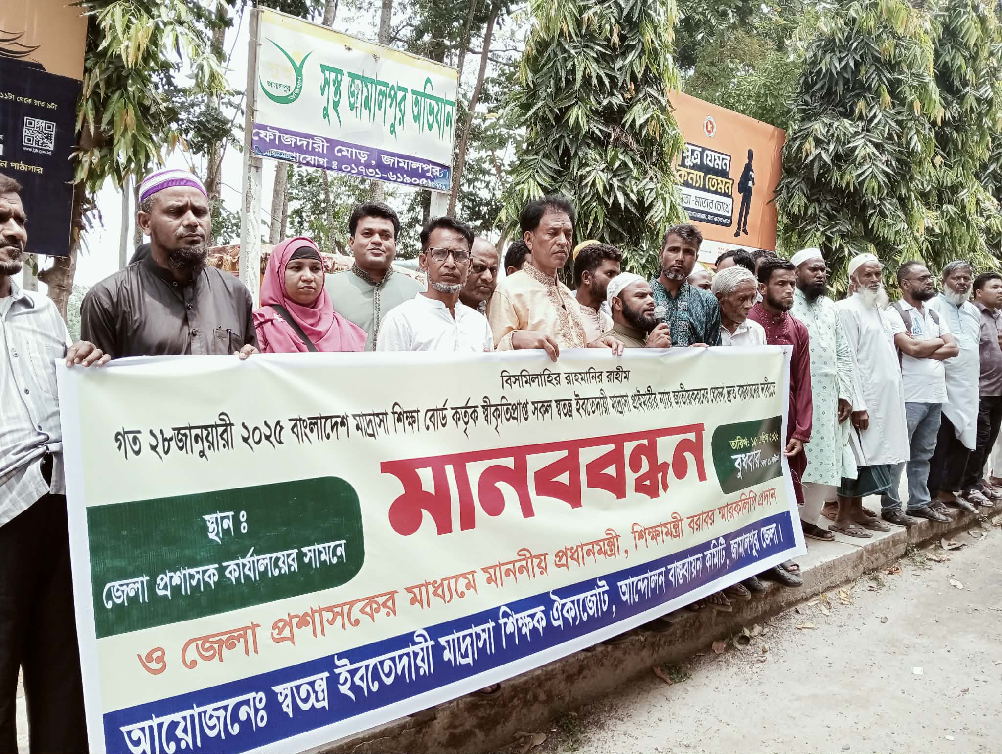 বাংলাদেশ মাদ্রাসা শিক্ষা বোর্ড কর্তৃক স্বীকৃতিপ্রাপ্ত অনুদানভুক্ত ও অনুদানবিহীন সকল স্বতন্ত্র ইফতেদায়ী মাদ্রাসা অন্তর্বর্তীকালীন সরকারের নির্দেশে শিক্ষা মন্ত্রণালয় কর্তৃক প্রাথমিক বিদ্যালয়ের ন্যায় জাতীয়করণের ঘোষণা দ্রুত বাস্তবায়নের দাবিতে জামালপুরে মানববন্ধন ও স্মারক লিপি প্রদান করেন স্বতন্ত্র ইবতেদায়ী মাদ্রাসা শিক্ষক ঐক্যজোট আন্দোলন বাস্তবায়ন কমিটি জেলা শাখার নেতৃবৃন্দ। বুধবার (১৫ এপ্রিল) দুপুরে জেলা প্রশাসকের কার্যালয়ের সামনে এ মানববন্ধন অনুষ্ঠিত হয়। স্বতন্ত্র ইবতেদায়ী মাদ্রাসা শিক্ষক ঐক্যজোট আন্দোলন বাস্তবায়ন কমিটি জামালপুর জেলা শাখার সভাপতি মো. ইমামুল হাসানের সভাপতিত্বে মানববন্ধনে বক্তব্য রাখেন স্বতন্ত্র ইবতেদায়ী মাদ্রাসা শিক্ষক ঐক্যজোট আন্দোলন বাস্তবায়ন কমিটি জেলা শাখার সাধারণ সম্পাদক আক্তারুজ্জামান, জ্যেষ্ঠ সহ-সভাপতি মাওলানা জাওহের আলী, সাবেক সভাপতি মাওলানা শেখ ফরিদ, বর্তমান কমিটির যুগ্ম-সাধারণ সম্পাদক আমিনুল ইসলাম, সাংগঠনিক সম্পাদক তারিকুল ইসলাম, প্রচার সম্পাদক রফিকুল ইসলাম, সদস্য মিজানুর রহমান, সদর উপজেলা শাখার সভাপতি আমিনুল ইসলাম হাশেম, কোষাধ্যক্ষ আমিনুল ইসলাম, সাবেক সাধারণ সম্পাদক ফারুক হোসন, ইসলামপুর উপজেলা শাখার সভাপতি শহিদুল ইসলাম, মেলান্দহ উপজেলা শাখার সভাপতি জয়নাল আবেদীন, সাংগঠনিক সম্পাদক মোছা. সাবিনা আক্তার, মাদারগঞ্জ উপজেলা শাখার সভাপতি আব্দুস সামাদ, সাধারণ সম্পাদক রিয়াজুর ইসলাম, বকশীগঞ্জ উপজেলা শাখার সাধারণ সম্পাদক এস এম নজরুল ইসলাম নয়ন প্রমুখ। এসময় বক্তারা বলেন, মাদ্রাসা শিক্ষার মানোন্নয়ন ও প্রসারের লক্ষ্যে আলিয়া শিক্ষার প্রাথমিক স্তর অনুমোদনের জন্য ১৯৭৮ অধ্যাদেশ ১৭(২) ধারা জারি করেন। সেই মোতাবেক ১৯৮৪ সালে বাংলাদেশ মাদ্রাসা শিক্ষা বোর্ড কর্তৃক প্রায় ১৮ হাজার স্বতন্ত্র ইবতেদায়ী মাদ্রাসার স্বীকৃতি প্রদান করা হয়। এই ধারাবাহিকতায় ১৯৯৪ সালে তৎকালীন সরকার রেজিষ্ট্রেশন প্রাপ্ত প্রাথমিক বিদ্যালয়ের ন্যায় স্বতন্ত্র ইবতেদায়ী মাদ্রাসার শিক্ষকদের ৫০০ টাকা ভাতা প্রদান করেন। তারা আরও বলেন, পরবর্তীতে ২০০১ সালে চার দলীয় ঐক্যজোট সরকার প্রাথমিক বিদ্যালয়ের ন্যায় স্বতন্ত্র ইবতেদায়ী মাদ্রাসার শিক্ষার্থীদের বিনা মূল্যে সরকারি ভাবে পাঠ্যপুস্তর বিতরণ ও উপবৃত্তি চালু করেন। কিন্তু বিগত সরকার ২০১৩ সালে ২৬০১৯টি রেজিষ্ট্রেশনকৃত প্রাথমিক বিদ্যালয় জাতীয়করণ করেন অথচ ১টি স্বতন্ত্র ইবতেদায়ী মাদ্রাসা জাতীয়করণ কিংবা এমপিওভুক্ত করার কোন উদ্যােগ গ্রহণ করেন নাই। বিগত সরকারের জাতীয়করণ কার্যক্রমে নিদ্যালয়সমূহ অন্তর্ভুক্ত হলেও দীর্ঘদিন যাবত স্বীকৃতিপ্রাপ্ত স্