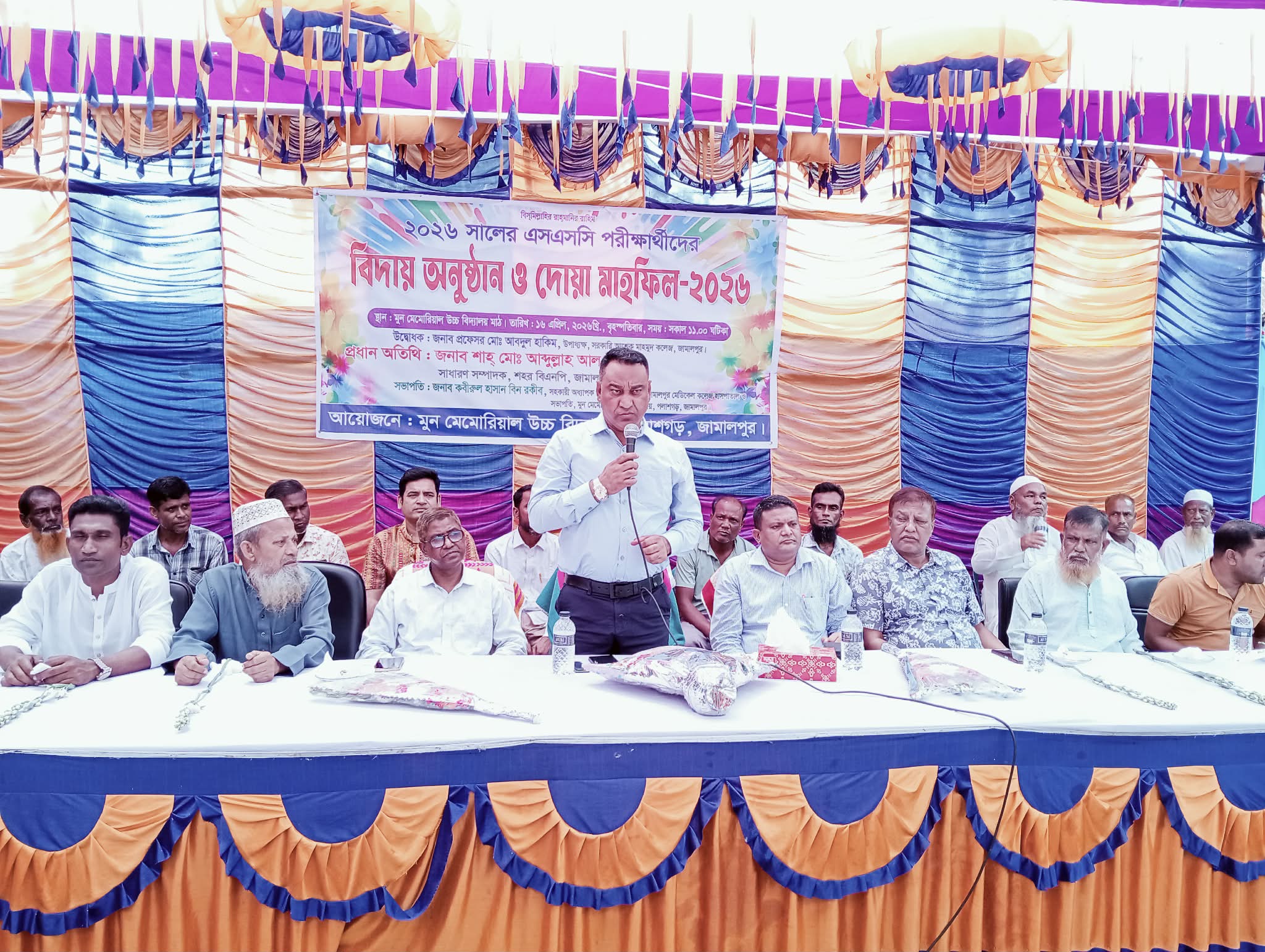 জামালপুর পৌরসভার পলাশগড়ে মুন মেমোরিয়াল উচ্চ বিদ্যালয়ের এসএসসি পরীক্ষায় অংশকারী শিক্ষার্থীদের বিদায় সংবর্ধনা ও দোয়া মাহফিল অনুষ্ঠিত হয়েছে। বৃহস্পতিবার (১৬ এপ্রিল) দুপুরে শহরের পলাশগড় অত্র স্কুল মাঠে এ অনুষ্ঠানের আয়োজন করা হয়। মুন মেমোরিয়াল উচ্চ বিদ্যালয়ের ম্যানেজিং কমিটির সভাপতি ও জামালপুর মেডিকেল কলেজ হাসপাতালের মেডিসিন বিভাগ সহকারী অধ্যাপক কবিরুল হাসান বিন রকীবের সভাপতিত্বে বিদায় সংবর্ধনা অনুষ্ঠানে প্রধান অতিথির বক্তব্য রাখেন শহর বিএনপির সাধারণ সম্পাদক শাহ আব্দুল্লাহ আল মাসুদ। প্রধান অতিথির বক্তব্যে বিএনপি নেতা শাহ আব্দুল্লাহ আল মাসুদ বলেন, আমাদের শিক্ষাজীবনের যে সিঁড়িগুলো সেই সিঁড়িগুলোর উপরে প্রথম ধাপ হচ্ছে এসএসসি। আমরা যদি এইখানে ভালো করি তাহলে আমাদের সামনে ভালো হবে। যদি কোন কারণে পিছিয়ে পরি তাহলে সামনে আমাদের বাধা আসবে। প্রত্যেকটা মানুষেরই লক্ষ্য থাকতে হবে। আমাদের জীবনে লক্ষ্য যদি স্থির করতে না পারি আমরা সাবলম্বী হবো না। সাফল্যে পৌঁছানো আমাদের কঠিন হয়ে যাবে। তাই আমি মনে করি প্রত্যেকটা ছাত্র-ছাত্রীর লক্ষ্যটা স্থির রাখতে হবে। তিনি আরও বলেন, প্রথম পরীক্ষাটা সবাই একটু আনইজি ফিল করে। পরে আস্তে আস্তে সব ঠিক হয়ে যায়। হতাশ হওয়া যাবে না। এসএসসি পরীক্ষার উপর কিন্তু বাকি জীবনটা নির্ভর করবে। জীবনের খুবই গুরুত্বপূর্ণ সময় টা হচ্ছে এসএসসি থেকে এইচএসসি পর্যন্ত। এই বিদায়ই বিদায় নয় সামনে আরো অনেক দূর যেতে হবে। মানুষ হিসেবে নিজেকে তৈরি করতে হবে। বড় হয়ে এই এলাকার দায়িত্ব নিতে হবে। এই প্রতিষ্ঠানের দায়িত্ব নিতে হবে তোমাদের। তোমার ভালো ভাবে পরিক্ষা দিবে আমরা এই দোয়া করি। এতে উদ্বোধকের বক্তব্য রাখেন সরকারি আশেক মাহমুদ কলেজের উপাধ্যক্ষ প্রফেসর মো. আবদুল হাকিম। মুন মেমোরিয়াল উচ্চ বিদ্যালয়ের সহকারী শিক্ষক আমিনুল ইসলামের সঞ্চালনায় বিদায় সংবর্ধনা অনুষ্ঠানে বিশেষ অতিথির বক্তব্য রাখেন শহর বিএনপির সহ-সভাপতি আব্দুল রাজ্জাক লিটন, জ্যেষ্ঠ সহকারী শিক্ষক আব্দুল জলিল, সহকারী শিক্ষক টুম্পা রাণী গোস্বামী প্রমুখ। আলোচনা সভা শেষে বিশেষ দোয়া করা হয়। দোয়া পরিচালনা করেন অত্র বিদ্যালয়ের সহকারী শিক্ষক কামরুল ইসলাম। মুন মেমোরিয়াল উচ্চ বিদ্যালয়ের এসএসসি পরীক্ষার্থীদের সকল প্রকার সরঞ্জাম উপহার দেন শহর যুবদলের যুগ্ম-আহবায়ক আলতাব হোসেন মন্ডল। মুন মেমোরিয়াল উচ্চ বিদ্যালয় থেকে ৭৫ জন শিক্ষার্থী এসএসসি পরীক্ষায় অংশগ্রহণ করবেন বলে জানান স্কুল কর্তৃপক্ষ। বিদায় সংবর্ধনা অনুষ্ঠানে রাজনৈতিক নেতৃবৃন্দ, অত্র বিদ্যালয়ের শিক্ষকগণ ও শিক্ষার্থীবৃন্দ উপস্থিত ছিলেন।