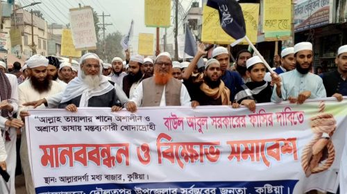 কুষ্টিয়ার দৌলতপুর উপজেলার আল্লার দর্গায় বাউল আবুল সরকারের ফাঁসির দাবিতে মানববন্ধন ও বিক্ষোভ মিছিল অনুষ্ঠিত হয়েছে। ২ ডিসেম্বর বিকেল সাড়ে চারটার দিকে আল্লার দর্গা মধ্যবাজার এলাকায় এই মানববন্ধন অনুষ্ঠিত হয়।…