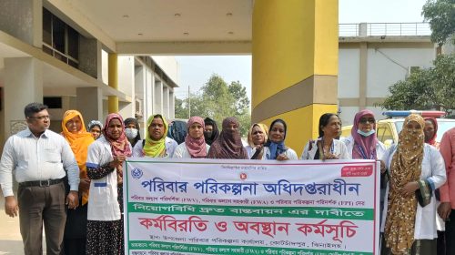 নিয়োগবিধি দ্রুত বাস্তবায়ন এর দাবীতে সারা বাংলাদেশে চলমান কর্মসূচির অংশ হিসেবে ঝিনাইদহের কোটচাঁদপুরে পরিবার পরিকল্পনা অধিদপ্তরাধীন কর্মরত সকল পরিবার কল্যাণ পরিদর্শিকা , পরিবার কল্যাণ সহকারী ও পরিবার পরিকল্পনা পরিদর্শকগণ…